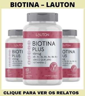 O Biotina Lauton contém 45mcg de Biotina (Vitamina B7) cada cápsula, assim como as Vitaminas C,B1,B2,B3,B5,B9 e B12, junto com o Zinco Quelato.
